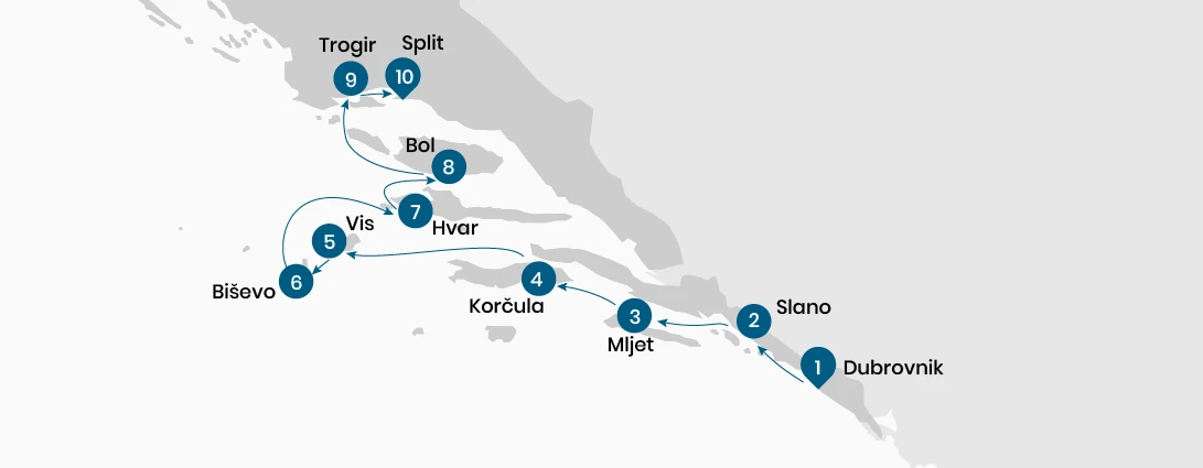 In the morning, we'll cruise towards Bol, best known for its Zlatni Rat (Golden Cape) beach, which regularly hits the top lists of the most beautiful European beaches. Once we stop in Bol, you can enjoy simple pleasures such as taking a walk around this nice little Dalmatian town and perhaps having a cup of coffee or swimming until lunch is served on board. After lunch, we'll continue cruising towards Trogir, another city inscribed on the UNESCO World Heritage list, arriving there during the afternoon. This town is literally packed with palaces, churches, and towers. Our local guide will take us for a sightseeing tour of Trogir with its historical sights and walls, churches and monasteries from Roman times, and more recent history. Overnight in Trogir Historical Town.