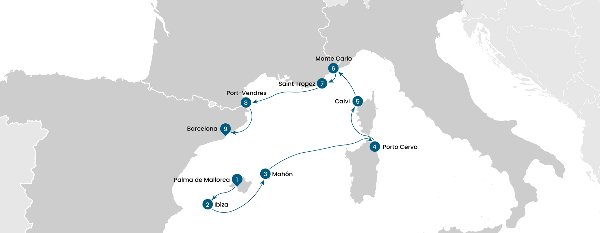 Zarpar desde Palma de Mallorca hacia Barcelona en un crucero de lujo de 10 días permite descubrir la esencia costera de España, Francia e Italia. La ruta incluye la vida isleña de Ibiza y Menorca, el estilo de Porto Cervo y Calvi, la elegancia de Montecarlo y el encanto mediterráneo de Saint-Tropez. La gastronomía de alto nivel, las experiencias guiadas y el confort de un moderno yate de Emerald Cruises completan esta travesía.