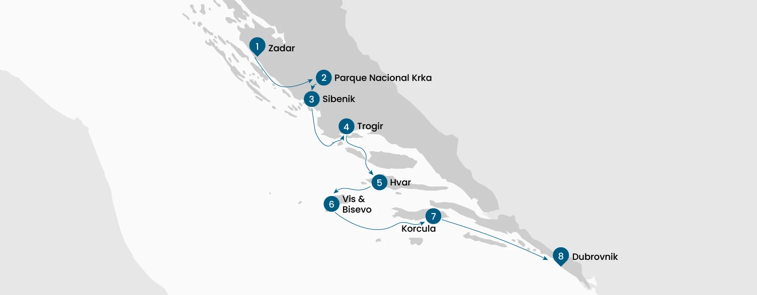 Tras el desayuno, navegamos hacia Vis, una de las islas más fascinantes de Croacia. Habrá tiempo para nadar en una tranquila bahía antes del almuerzo a bordo. Por la tarde llegamos a Vis, antigua base naval yugoslava cerrada al turismo durante décadas, lo que le permitió conservar su autenticidad—“el Mediterráneo tal como era”. Cerca de las ruinas de Issa, la primera ciudad croata, visitaremos una bodega familiar instalada en un antiguo túnel militar. Noche en Vis.