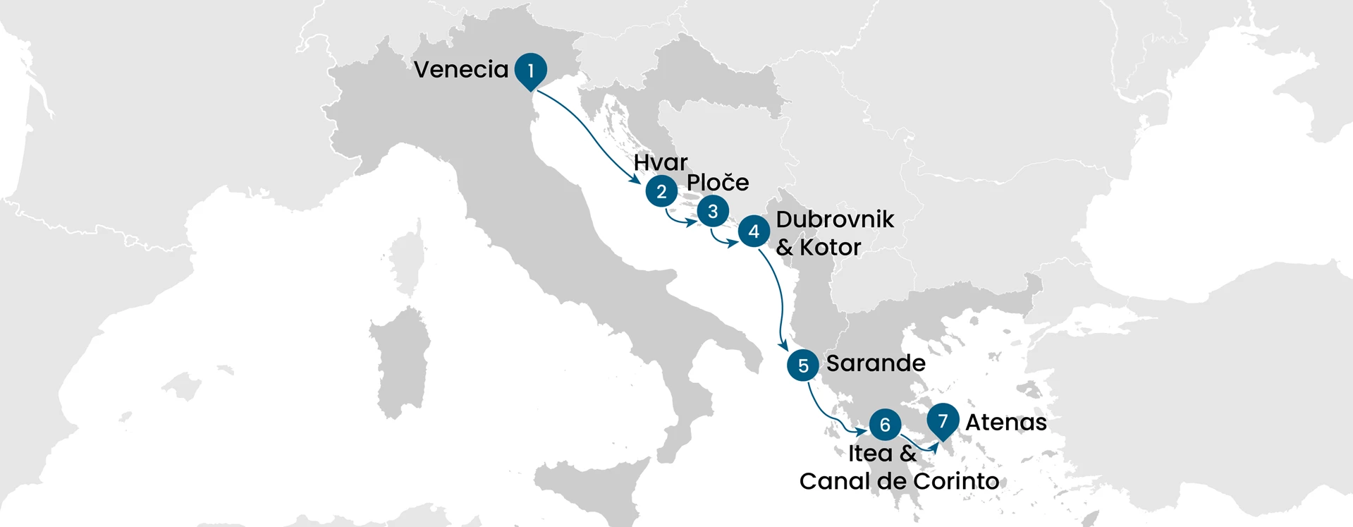 Desde el puerto de Itea, visita Delfos, uno de los lugares sagrados más emblemáticos de Grecia antigua, o el monasterio de San Lucas, joya bizantina. Más tarde, vive una experiencia única: la travesía del Canal de Corinto, excavado entre acantilados desde el siglo XIX.