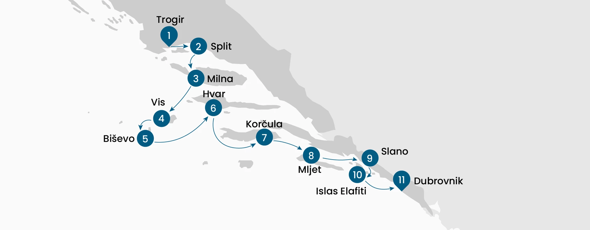 Esta mañana navegaremos hacia Split para realizar una visita guiada por el paseo marítimo y el Palacio de Diocleciano, declarado Patrimonio de la Humanidad por la UNESCO. Descubriremos restos romanos, edificios renacentistas y góticos, el Templo de Júpiter, el Peristilo y la Catedral. Después continuaremos hacia Milna, en la isla de Brac, con una parada para nadar en una bahía virgen (si el tiempo lo permite) y almuerzo a bordo. En Milna visitaremos el Museo del Aceite de Oliva para conocer las tradiciones de la isla y degustar aceite de oliva casero. Noche en Milna.