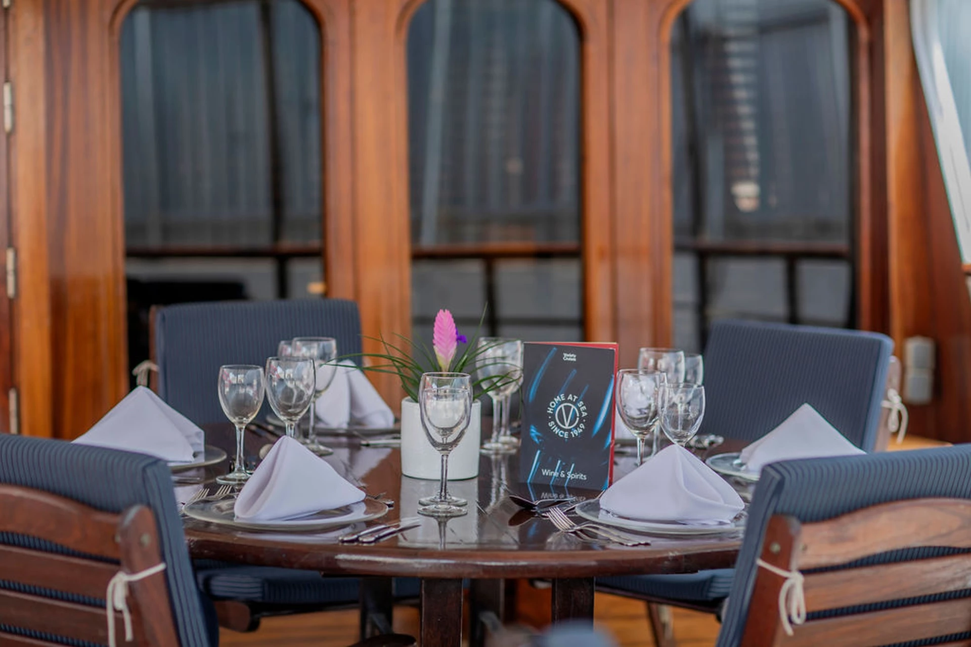 Each of the 17 cabins offers a comfortable ocean-view retreat, with windows or portholes, en-suite bathrooms with marble finishes, and individually controlled air conditioning. Cabins also include flat-screen TVs, mini safes, and mini fridges, providing everything needed for a pleasant stay after a day of exploration.